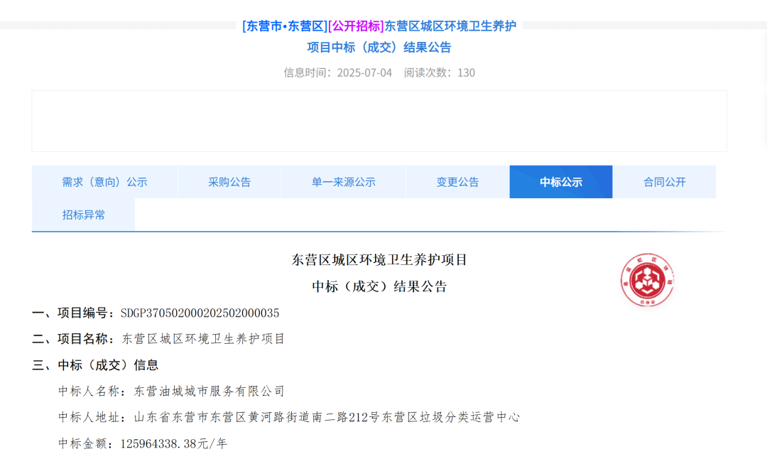 环卫在线网讯,7月4日,山东省东营区城区环境卫生养护项目中标结果公告出炉,中标供应商为东营油城城市服务有限公司,中标年化额约1.26亿元/年,服务年限1年,最多可续签2年,总服务费可达3.77亿元。